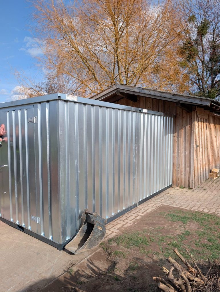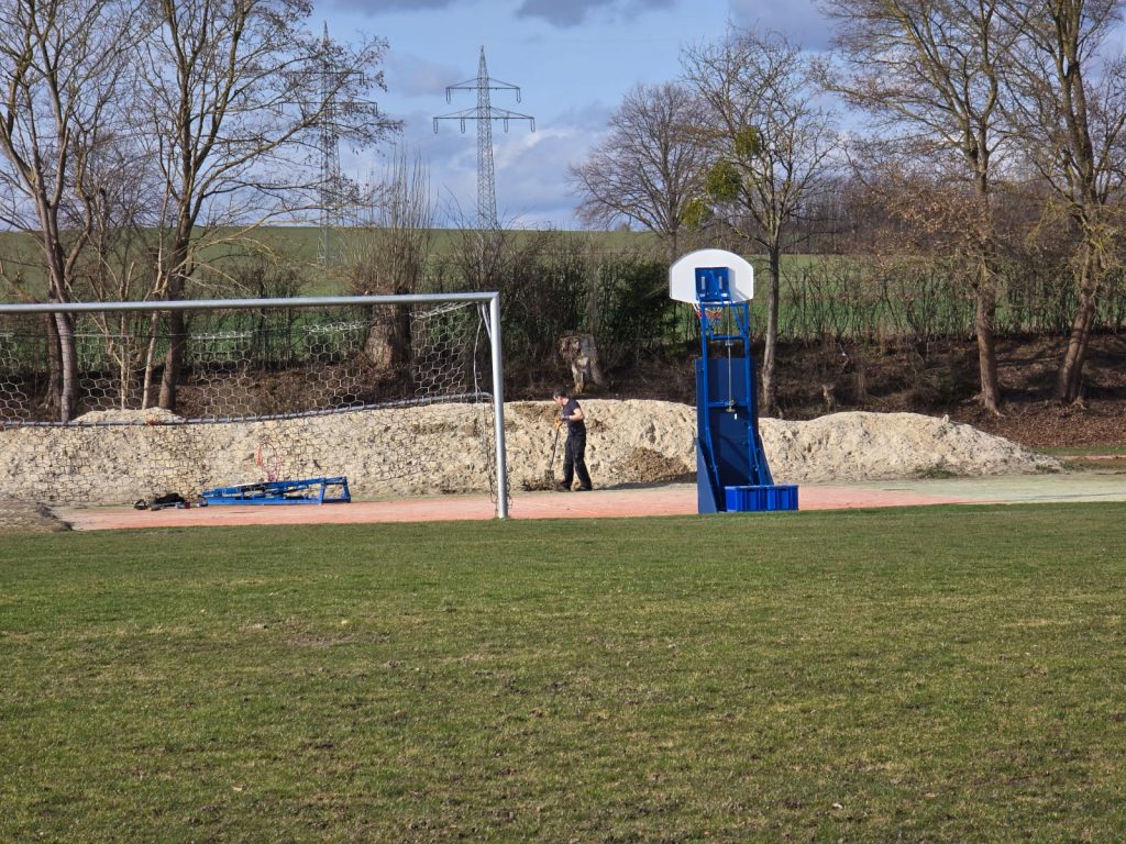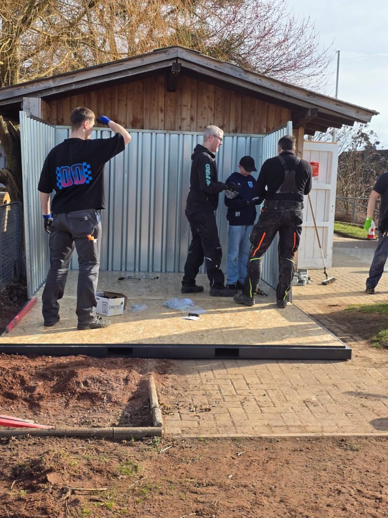 Das große Ziel des Tages wurde erreicht: Der neue Material-Container steht! Mit vereinten Kräften aufgebaut, schafft er nun dringend benötigten Platz für das umfangreiche Trainingsequipment der zehn Mannschaften, die Woche für Woche auf dem Sportplatz im Einsatz sind.