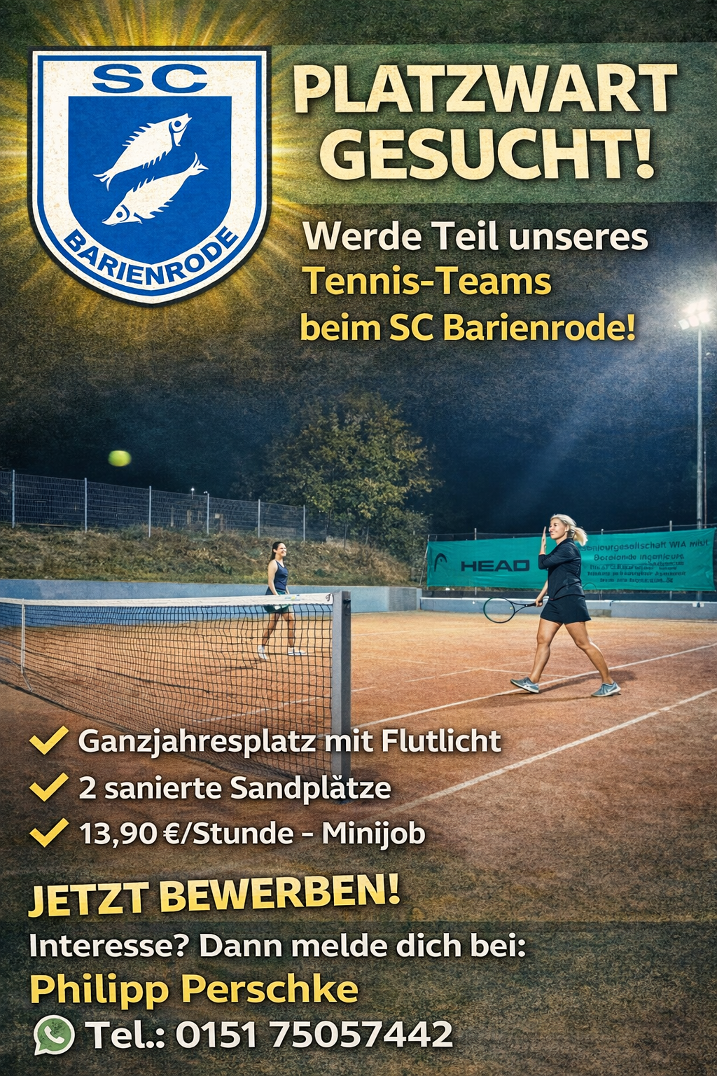 Der SC Barienrode sucht zum 01.04.2026 einen engagierten, zuverlässigen und tatkräftigen Platzwart (m/w/d), der unsere Tennisanlage mit Herz, handwerklichem Geschick und einem grünen Daumen betreut.
