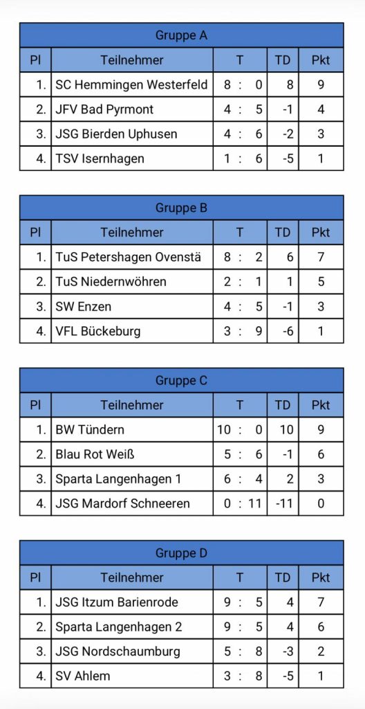 Am Ende steht der 1. Platz in Gruppe D – das ist eine starke Reaktion der Jungs. Die Chancenverwertung war heute sehr gut, nahezu jeder Abschluss auf das Tor führte zum Erfolg. Durch die größeren, ungewohnten Tore brauchte es am Anfang etwas Anpassung.